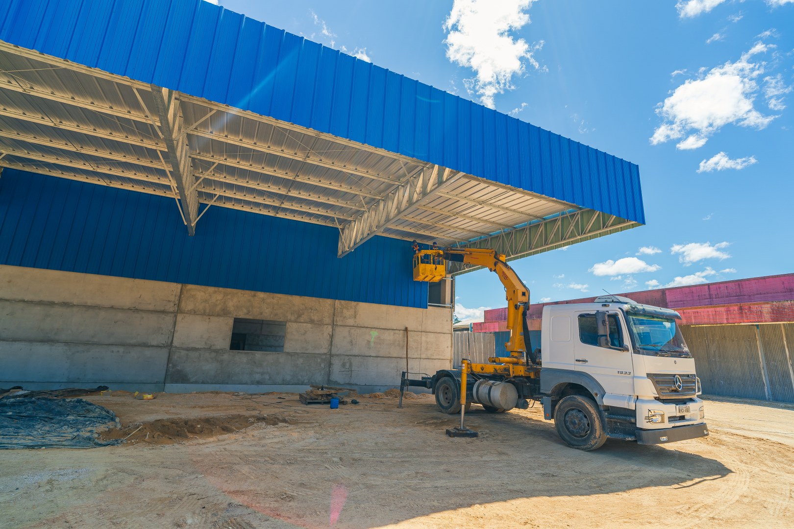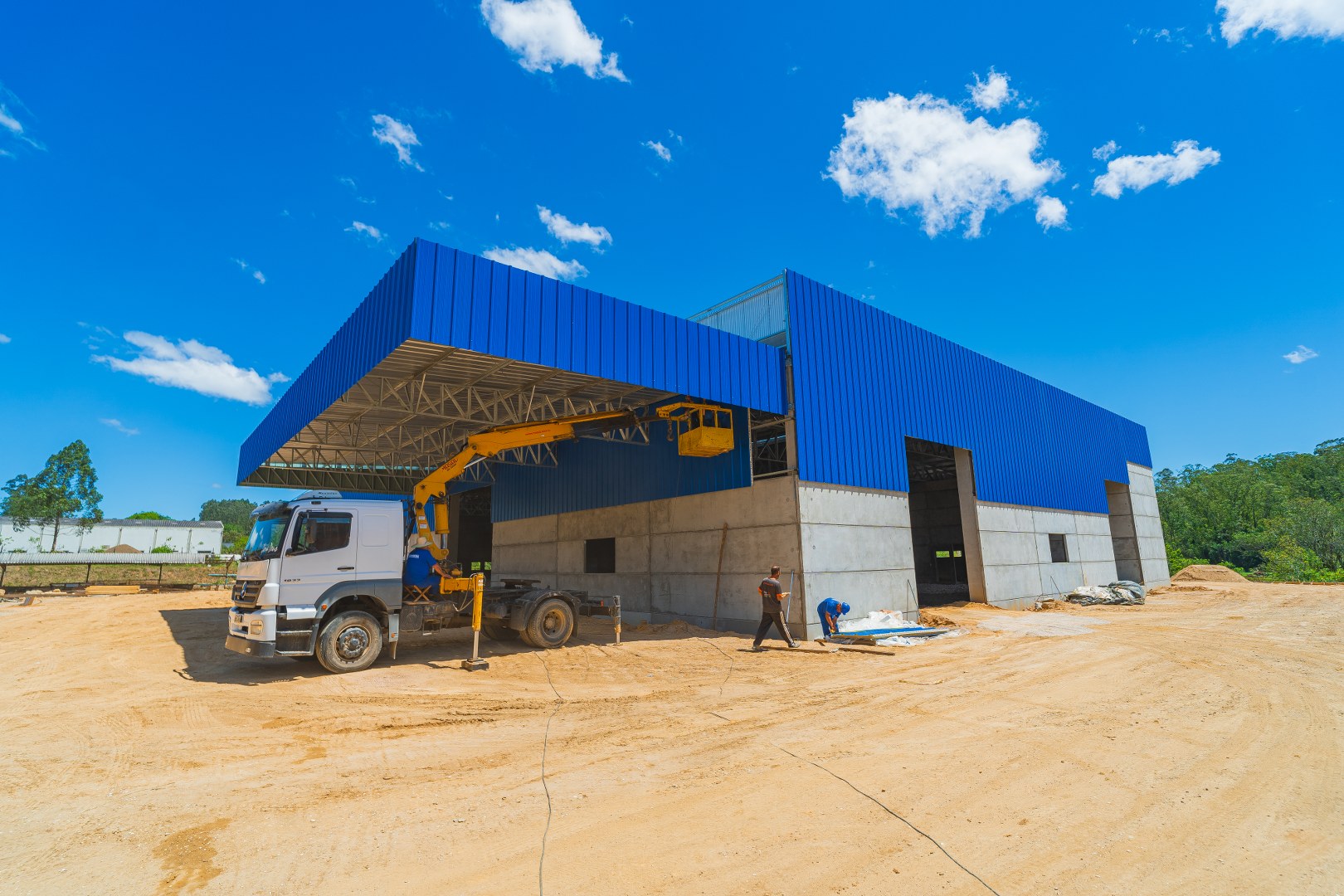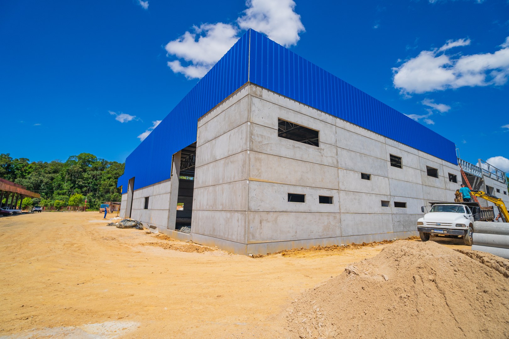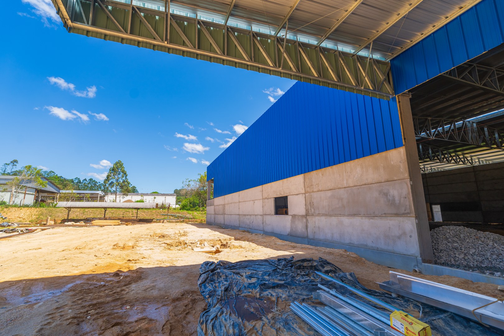 A obra possui pé direito de 7 metros, rede pluvial interna integrada aos pilares e foi planejada para permitir futuras ampliações de maneira simples e eficiente.