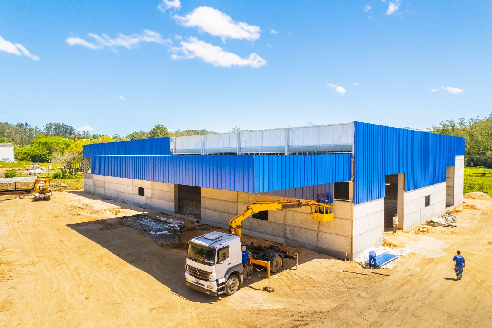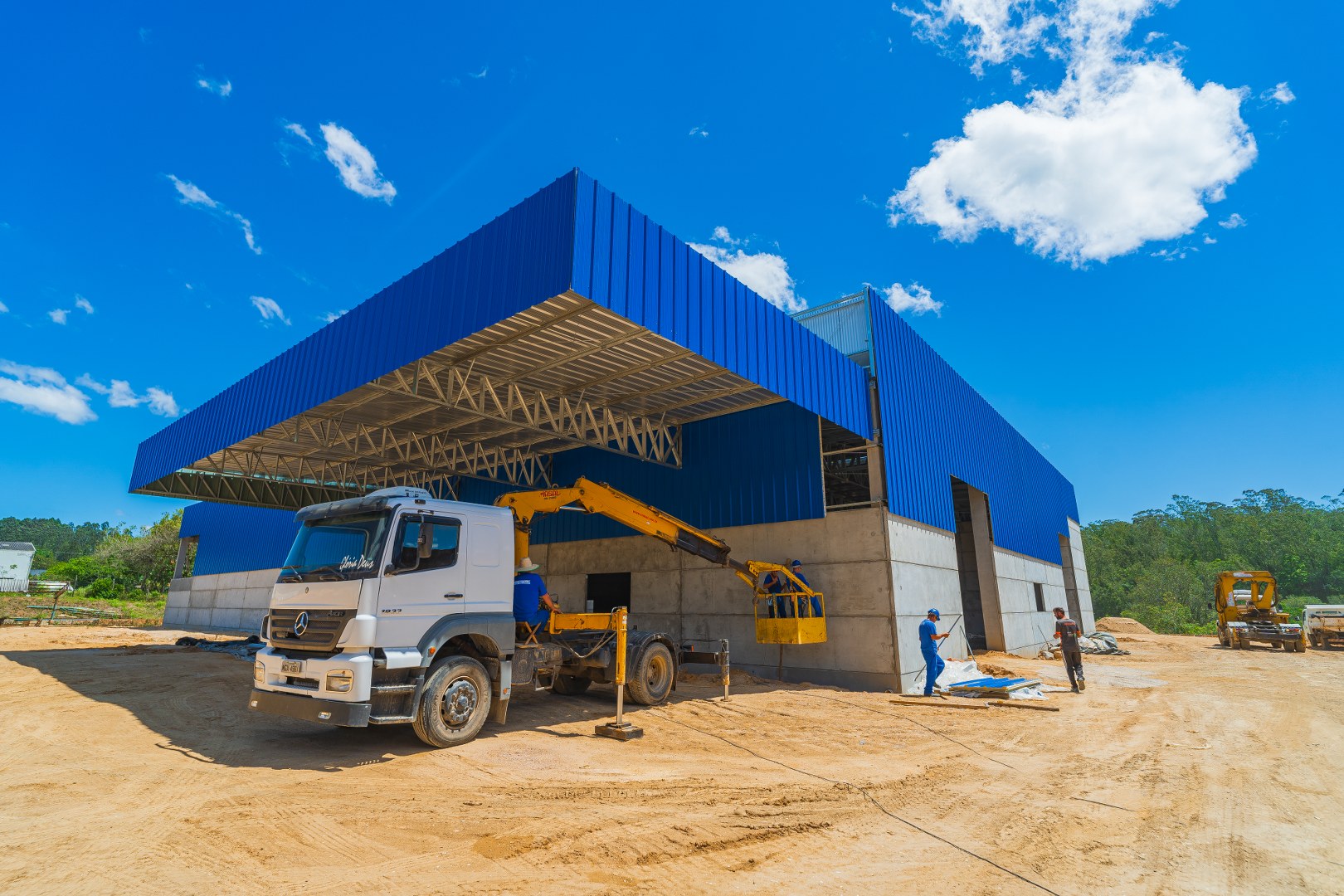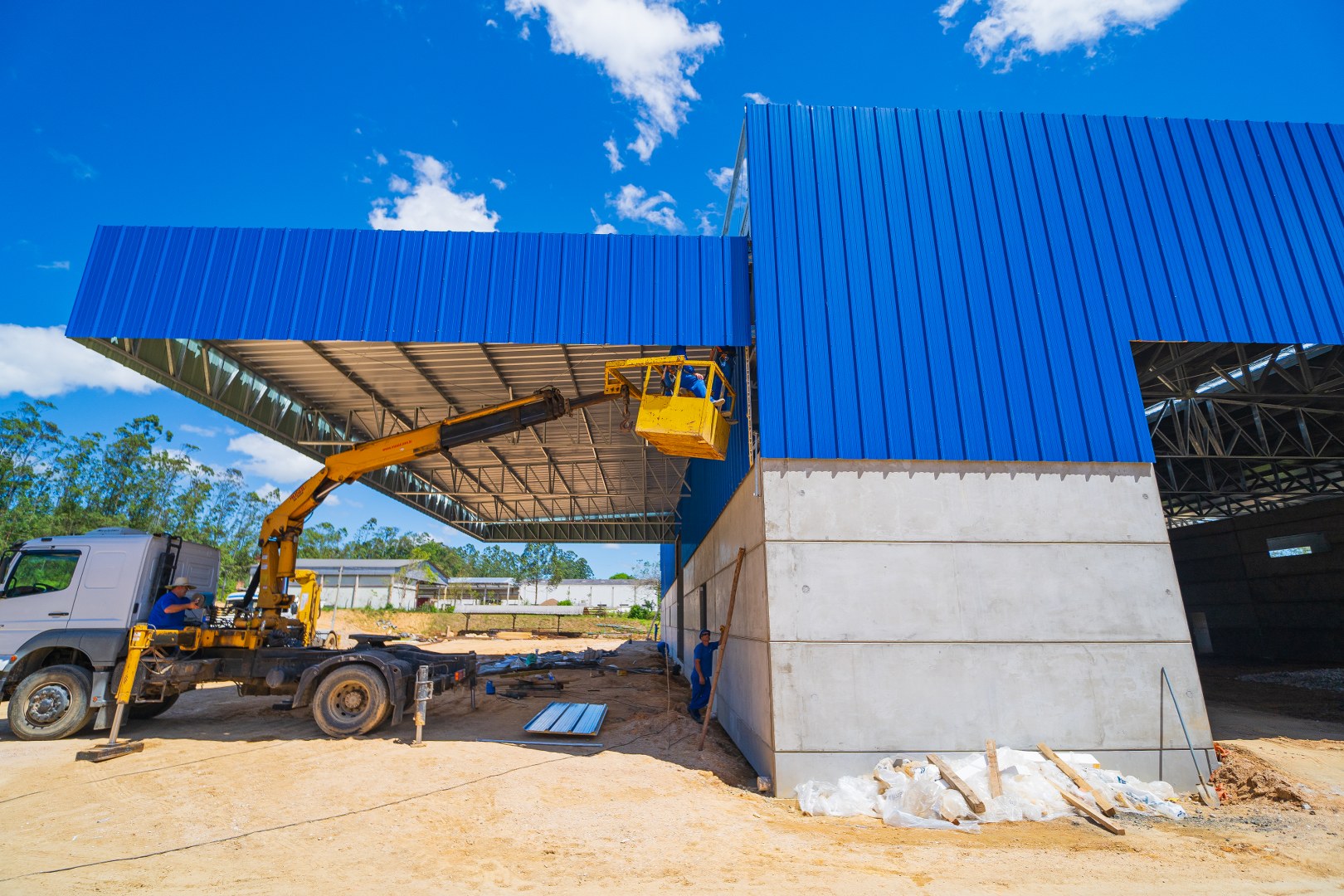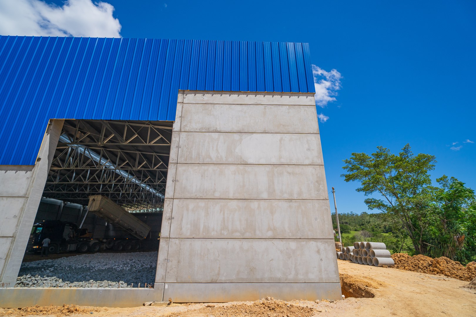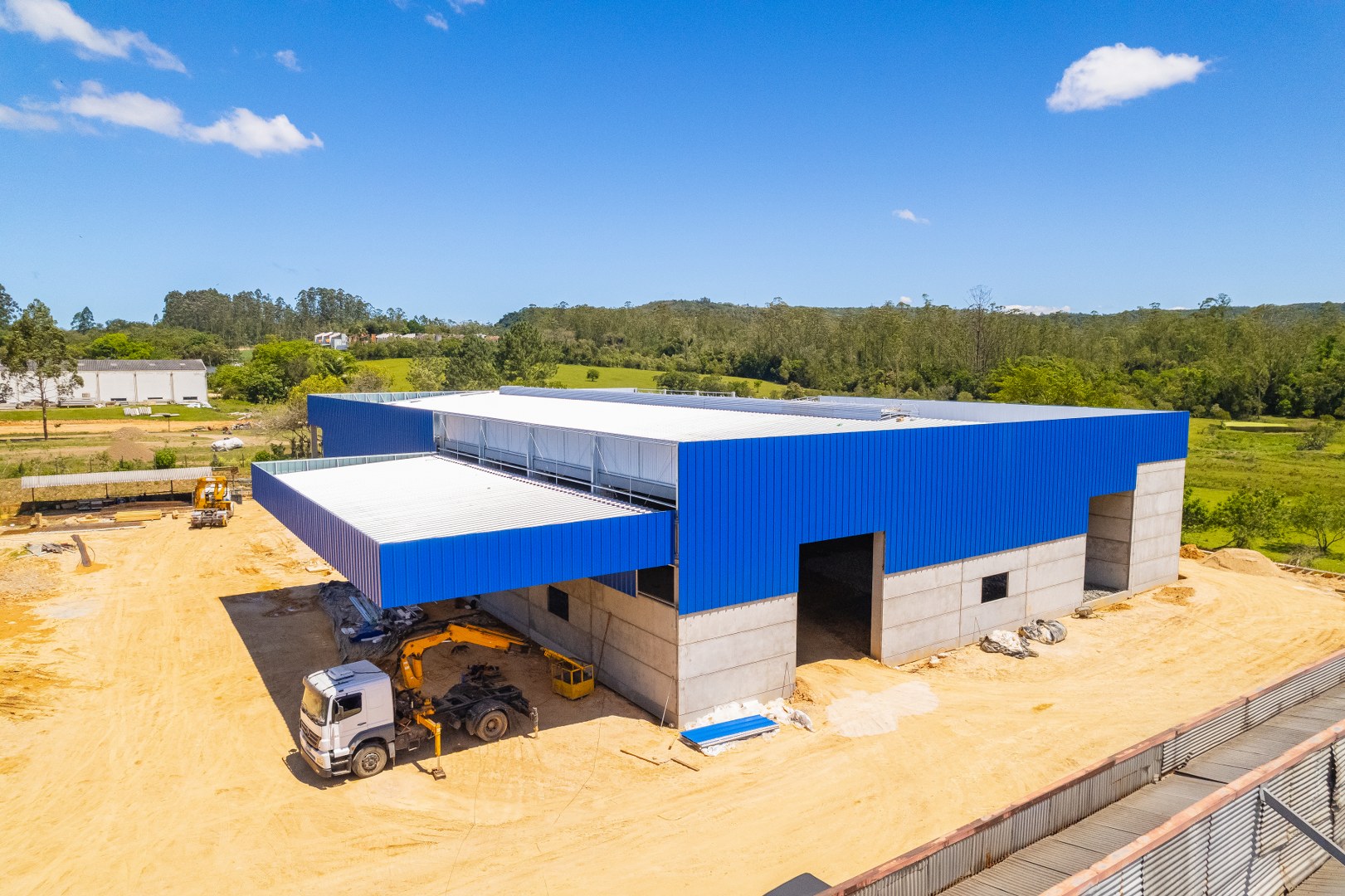 A obra possui pé direito de 7 metros, rede pluvial interna integrada aos pilares e foi planejada para permitir futuras ampliações de maneira simples e eficiente.