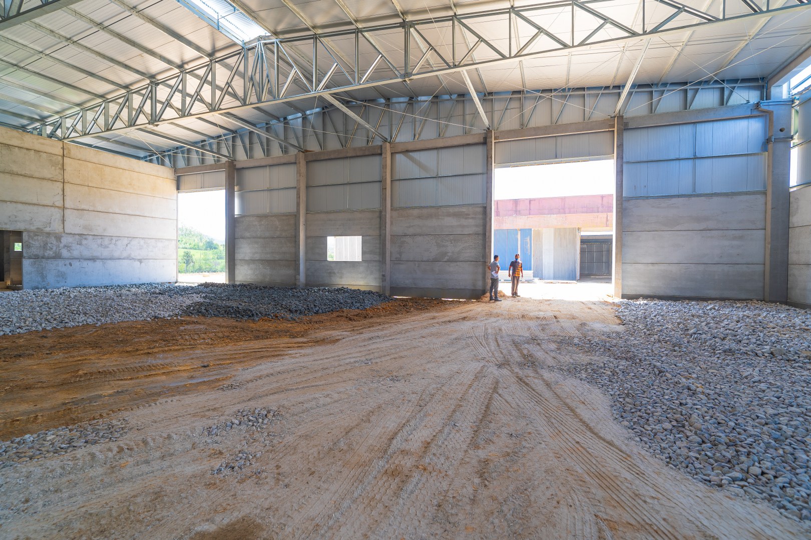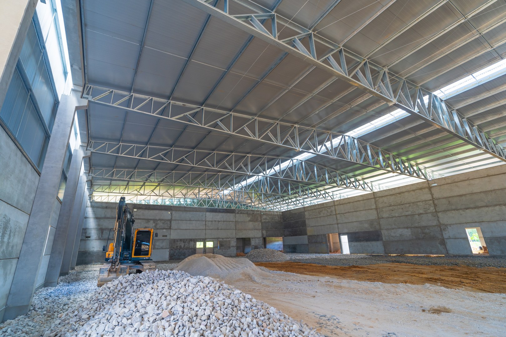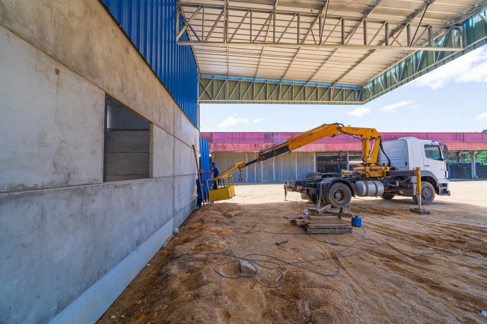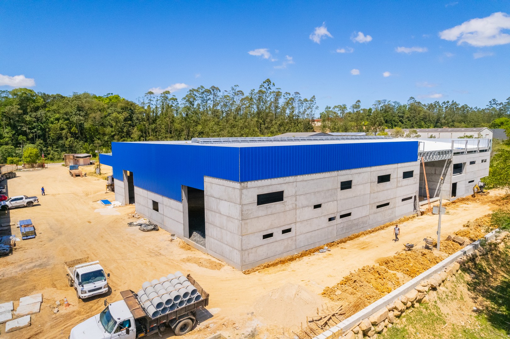 A obra possui pé direito de 7 metros, rede pluvial interna integrada aos pilares e foi planejada para permitir futuras ampliações de maneira simples e eficiente.
