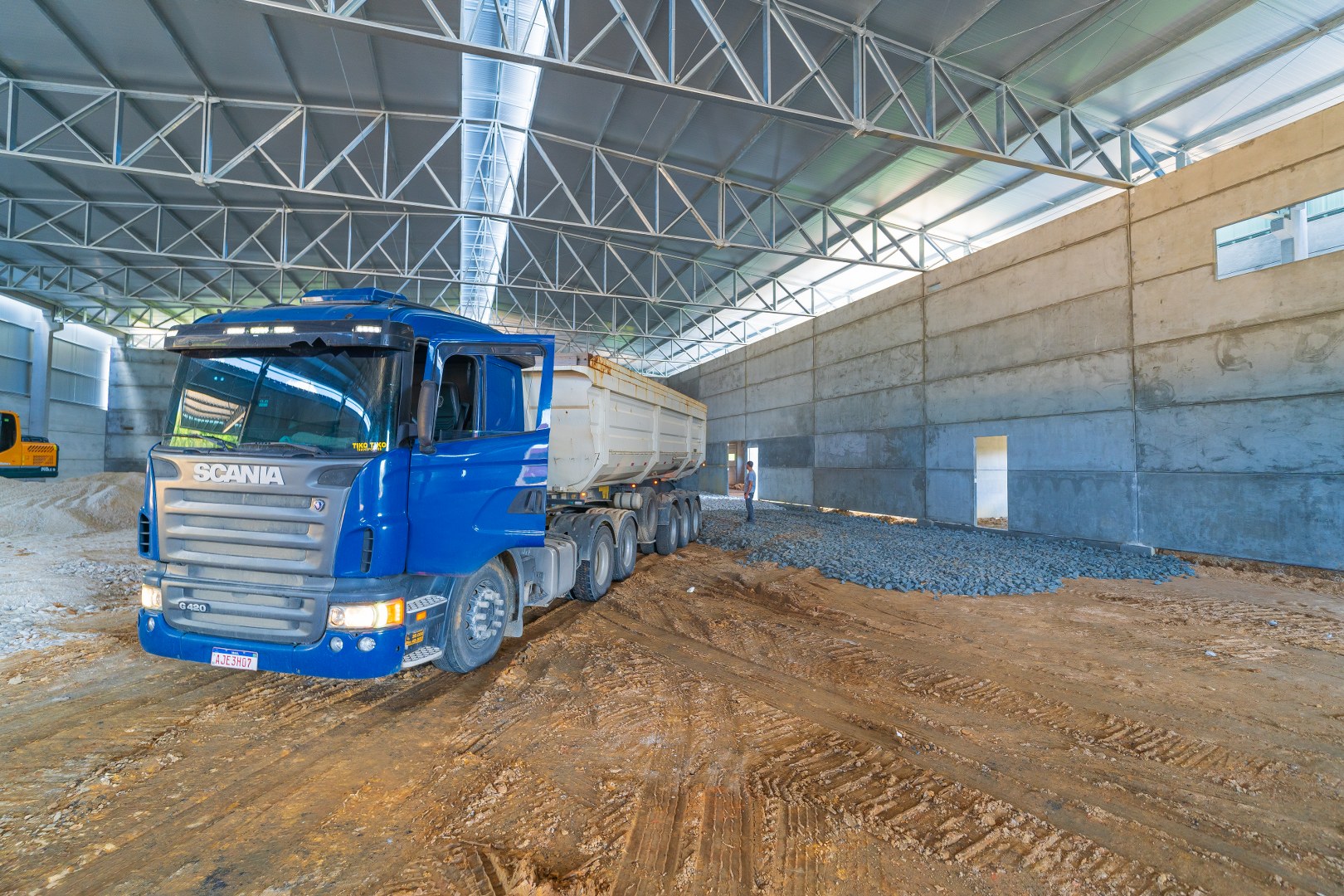 As paredes internas e externas foram executadas em placas de concreto pré-fabricadas, garantindo economia, agilidade na execução e excelente desempenho térmico e acústico. A cobertura metálica, com vão de 35 metros e sem pilares intermediários, foi realizada em parceria com a Tecnometal, proporcionando amplitude e eficiência operacional. Os alpendres contam com balanço de 10 metros, agregando funcionalidade à área de cargas e descargas.