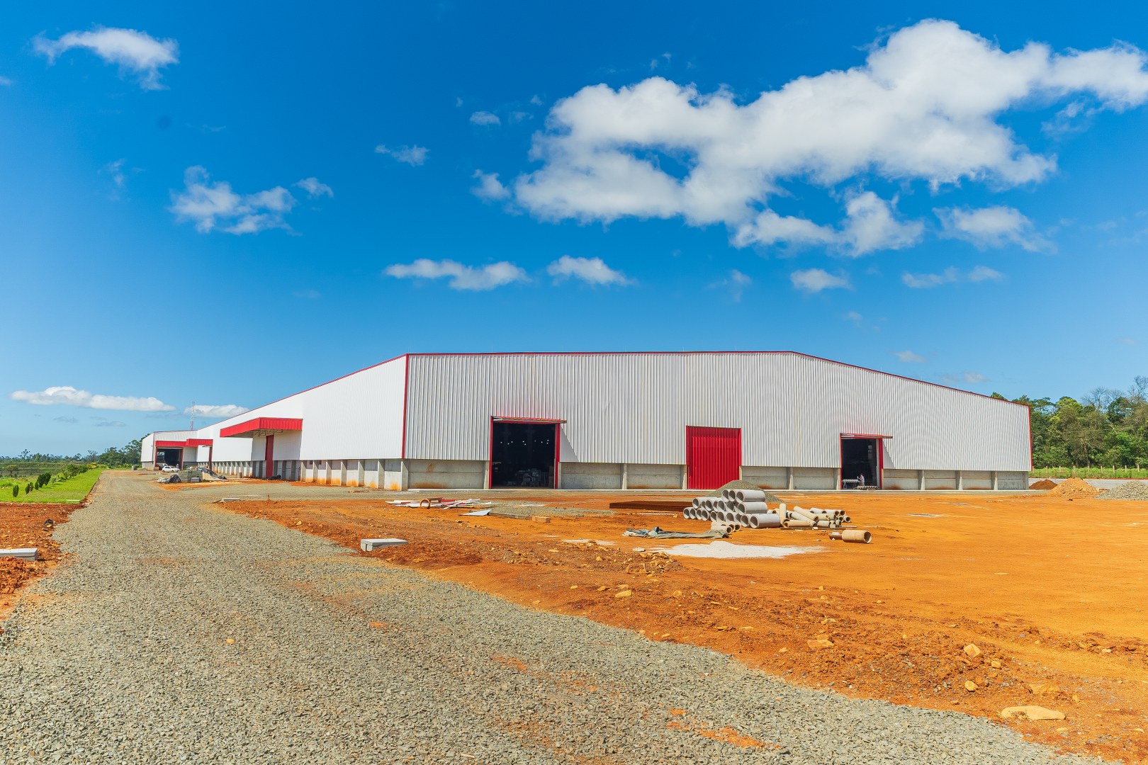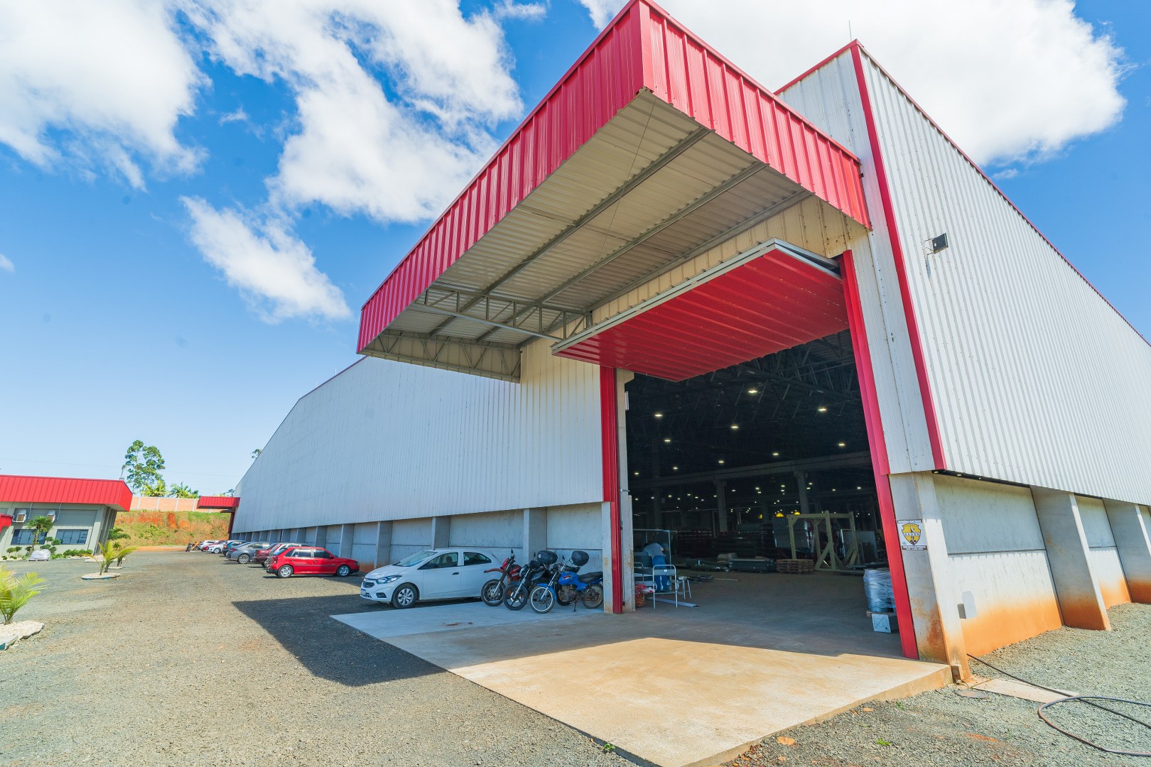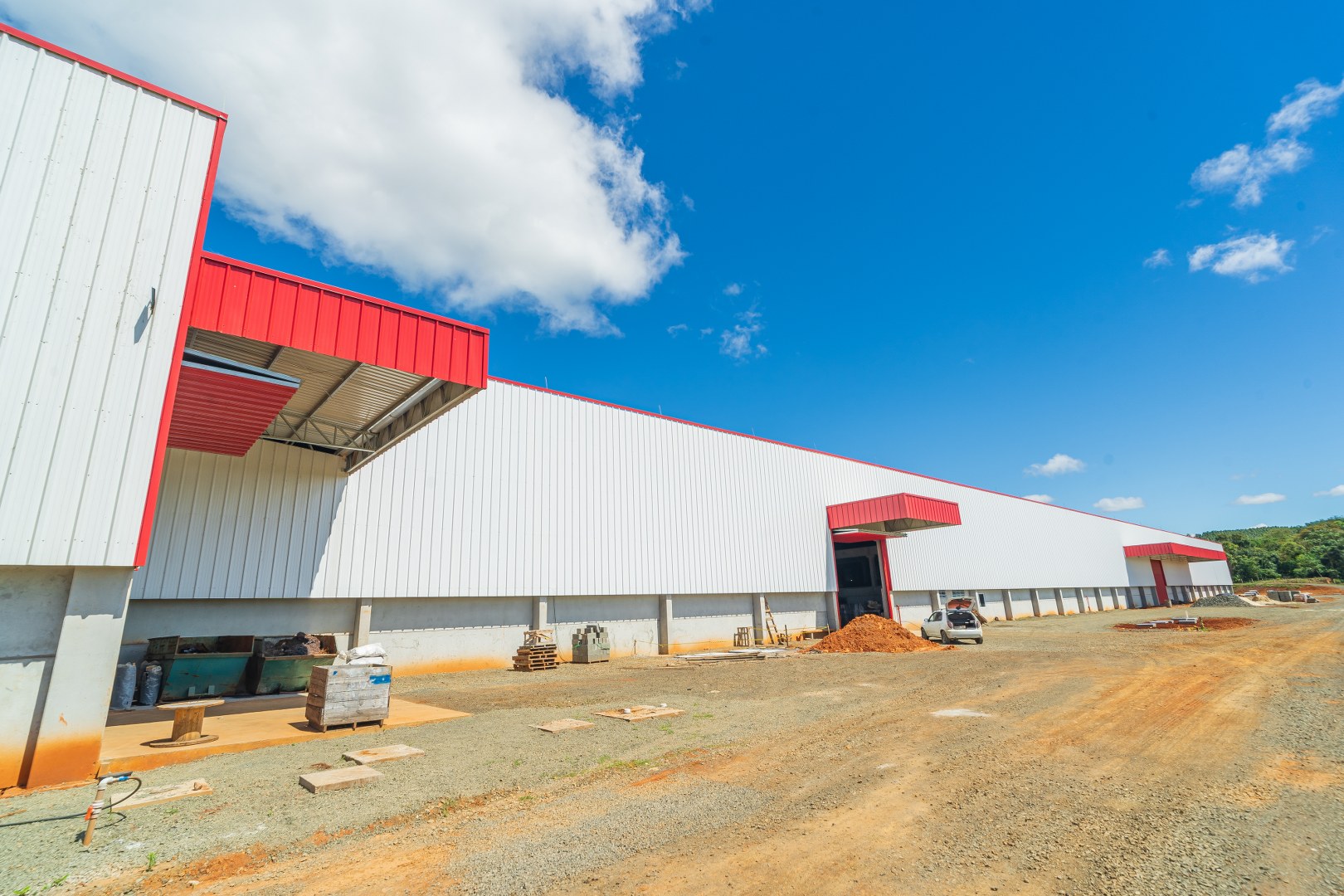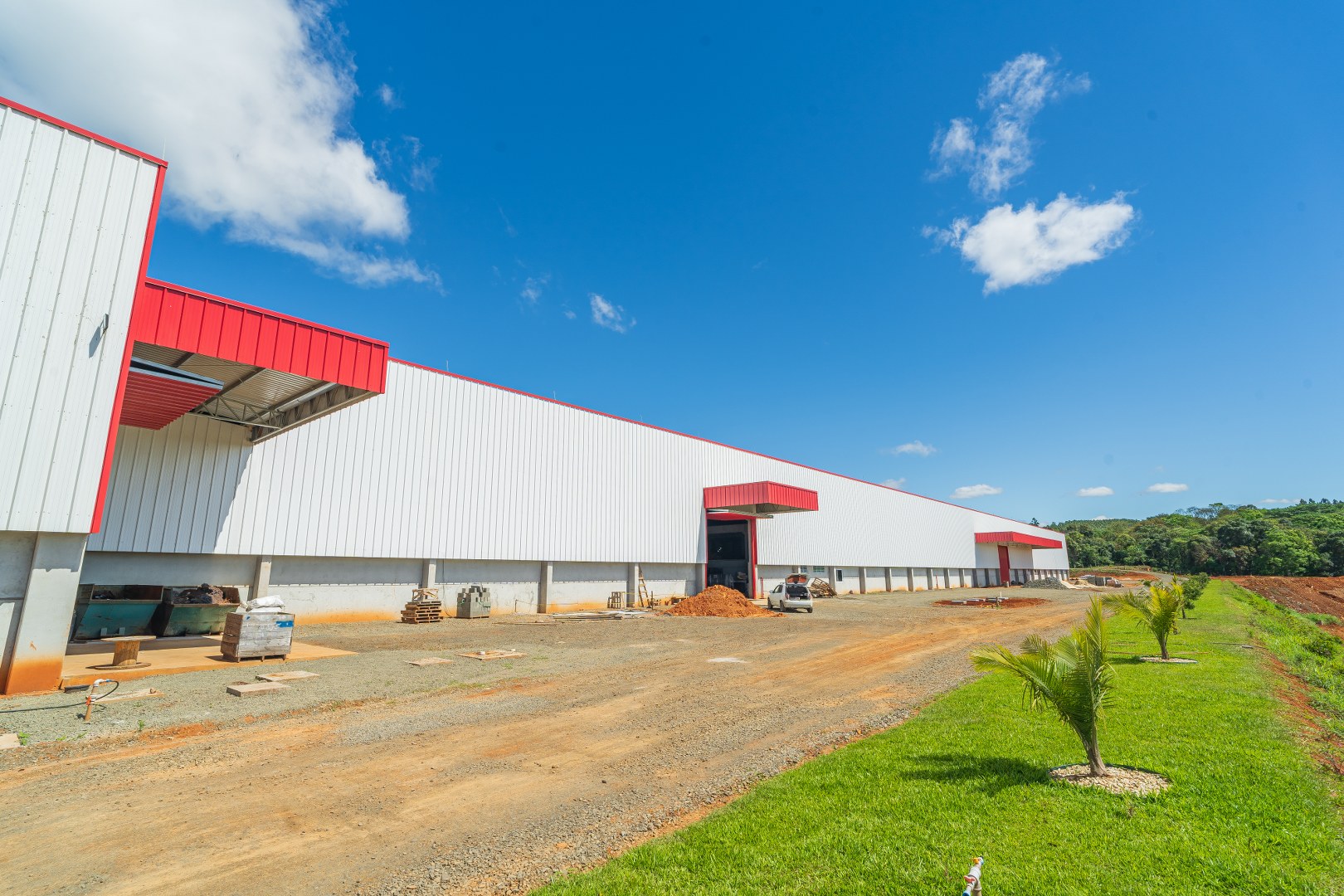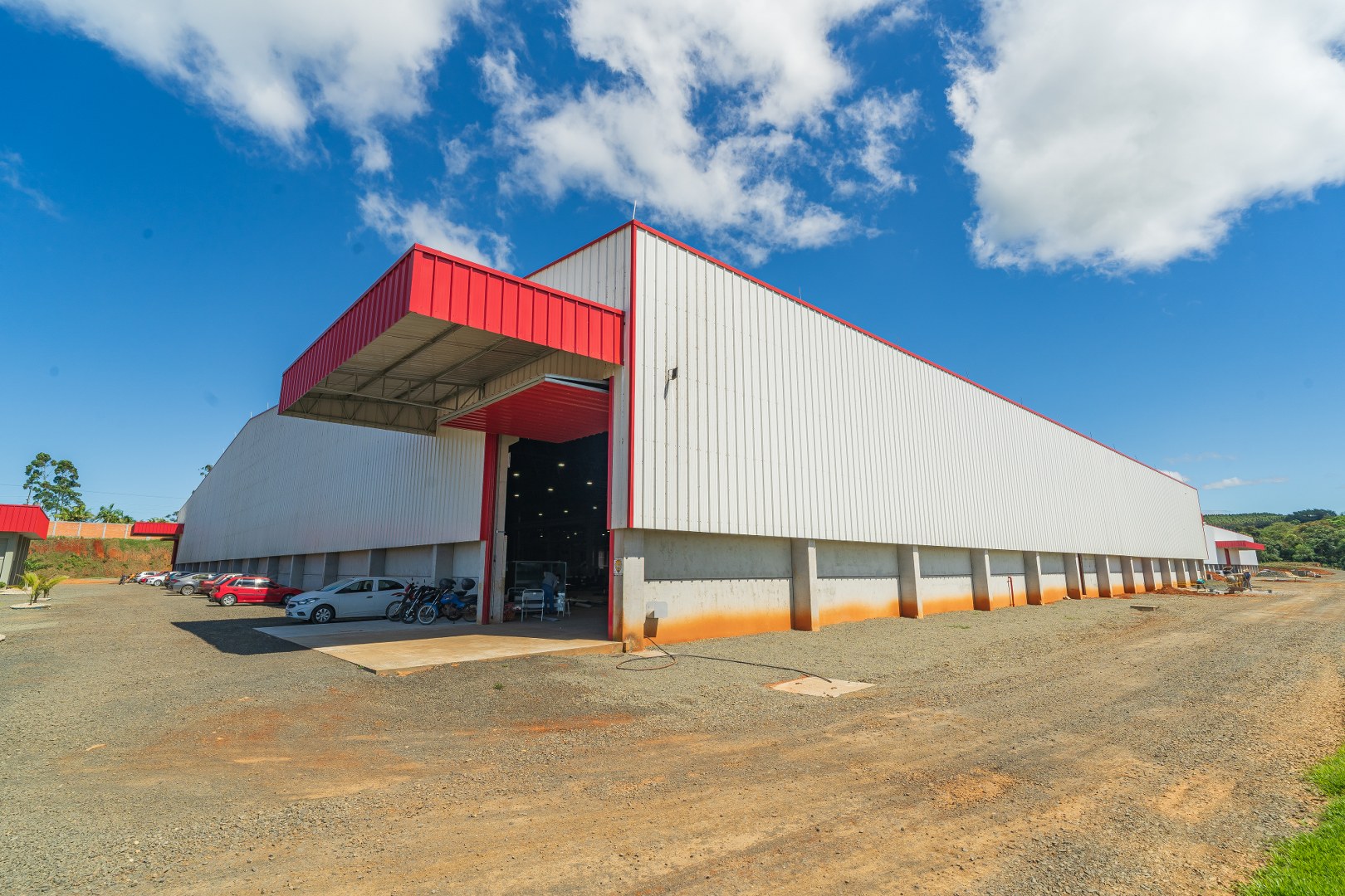 Obra Principal: Estrutura industrial e comercial com 21.500 m2, composta inicialmente por duas etapas (1a etapa: 81x169m, 2a etapa: 101x76m) e mezanino de 14×12,5m. O galpão conta com ponte rolante de concreto pré-fabricado com capacidades de 5 e 15 toneladas, fechamento das paredes em placas de concreto pré-fabricado e telhas metálicas. A cobertura foi executada com estrutura metálica em parceria com a Tecnometal. O pé direito é de 9,40 metros, e a rede pluvial está integrada aos pilares.