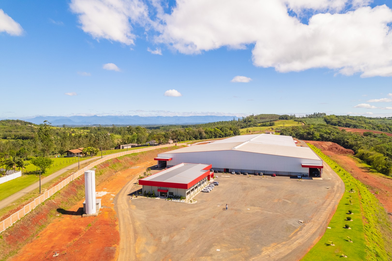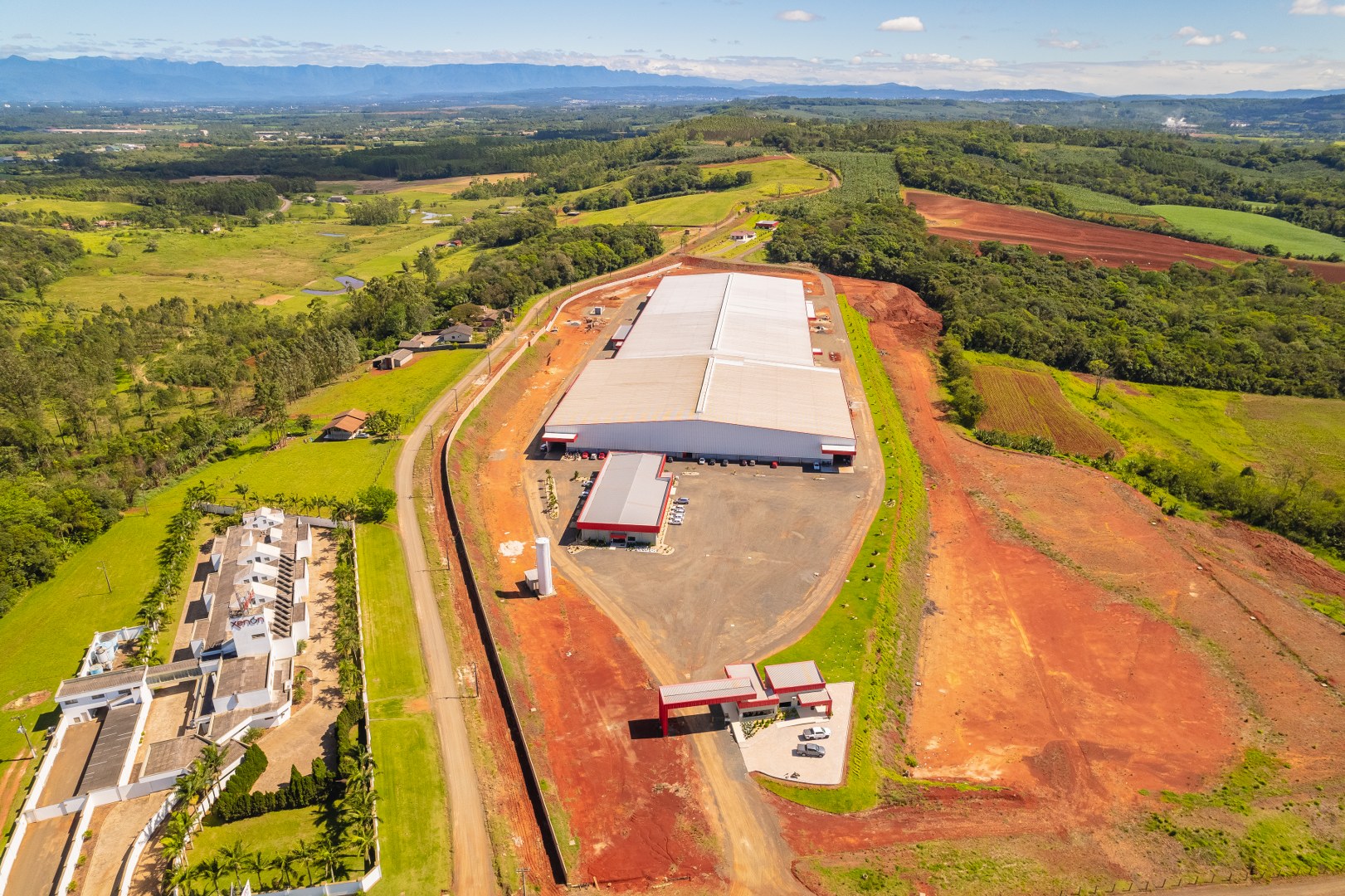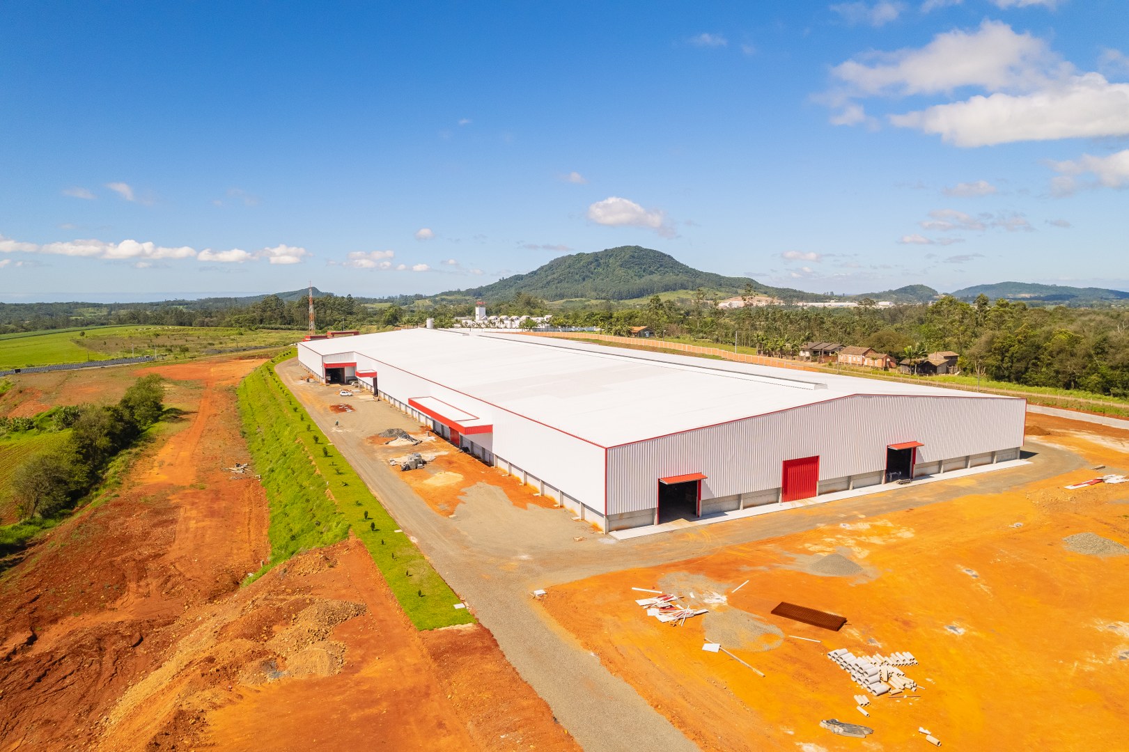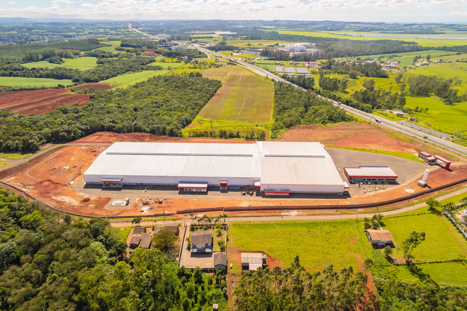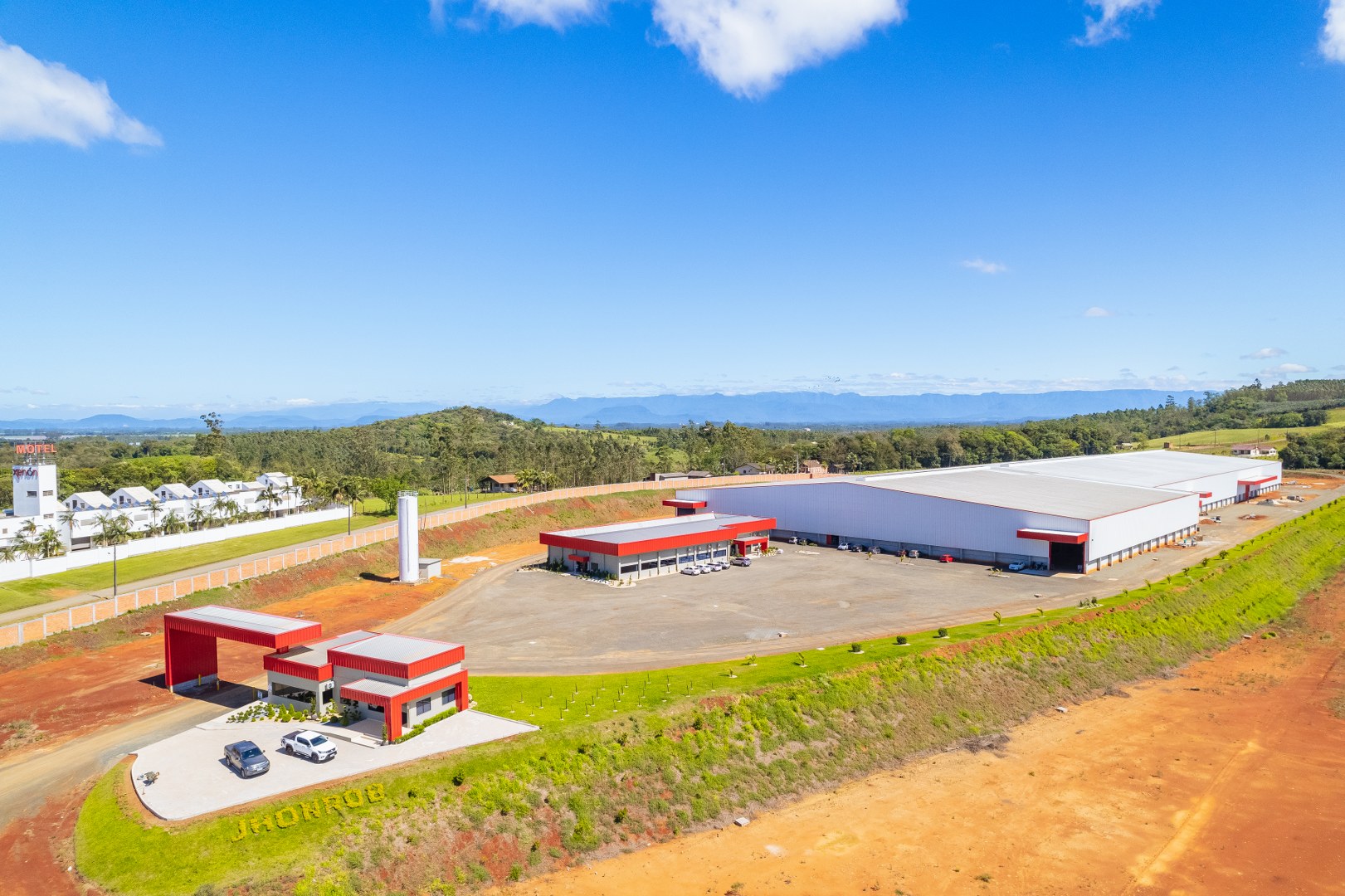 Obra Principal: Estrutura industrial e comercial com 21.500 m2, composta inicialmente por duas etapas (1a etapa: 81x169m, 2a etapa: 101x76m) e mezanino de 14×12,5m. O galpão conta com ponte rolante de concreto pré-fabricado com capacidades de 5 e 15 toneladas, fechamento das paredes em placas de concreto pré-fabricado e telhas metálicas. A cobertura foi executada com estrutura metálica em parceria com a Tecnometal. O pé direito é de 9,40 metros, e a rede pluvial está integrada aos pilares.