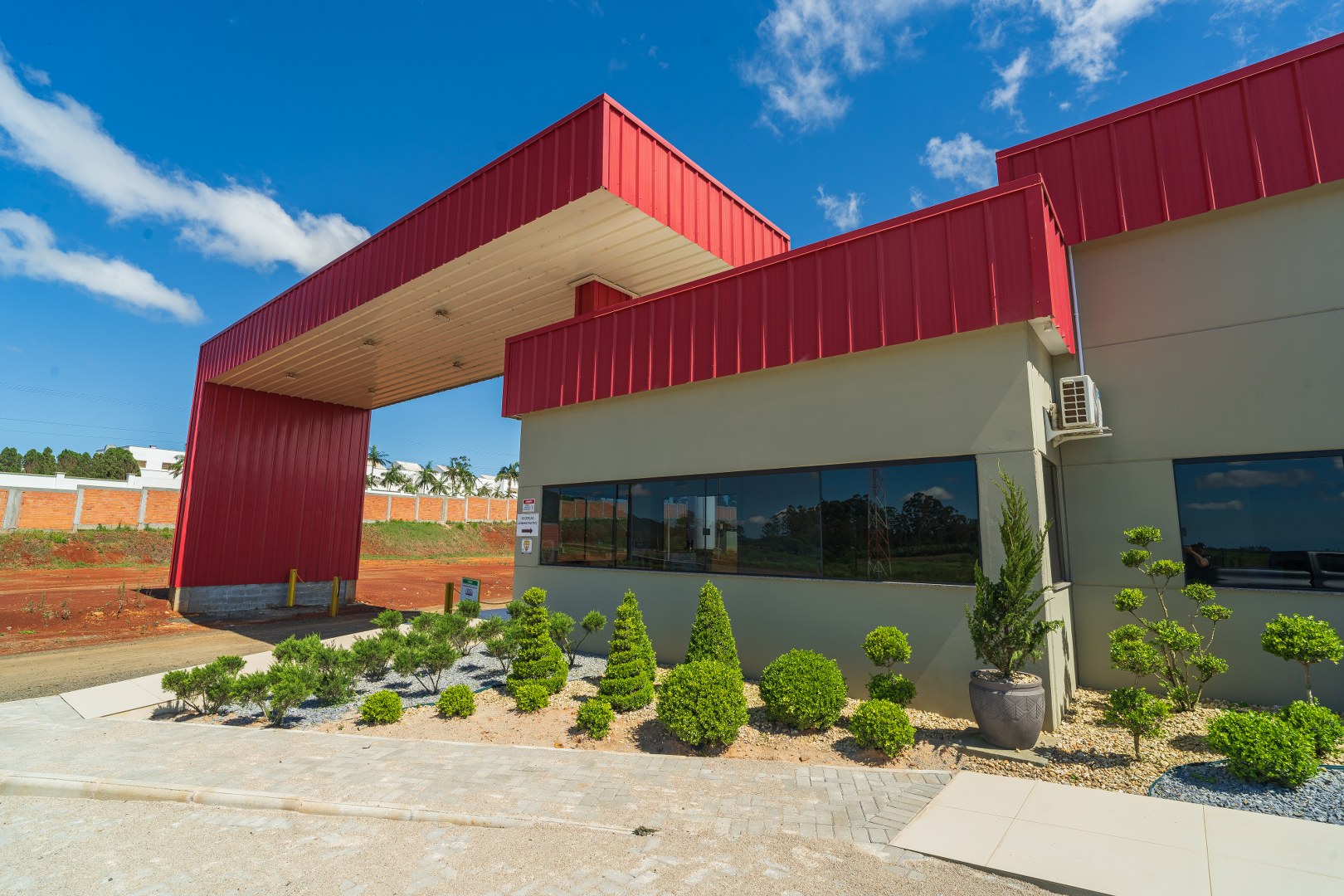 Guarita: Estrutura de 160 m2 (10x16m), com fechamento em painéis de concreto pré-fabricado, cobertura metálica (Tecnometal) e rede pluvial interna aos pilares. Possui estrutura para pórtico de entrada, com vão de 20 metros e 6 metros de altura, e pé direito de 5 metros.